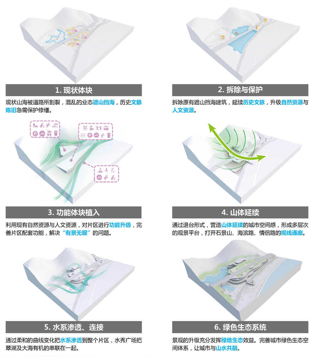 混乱的物业及业态占据城市公共观海登山景观界面,拆除原有遮山挡海建筑,开放石景山、 海滨路、情侣路的视线通廊,腾出宝贵的用地营造城市公共开放空间,布置水秀广场,打通本案与海滨公园的天然联系。