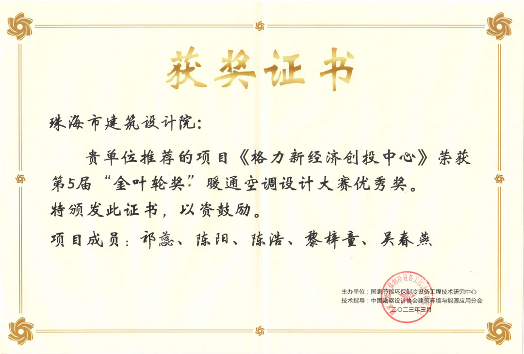近日,第5届“金叶轮奖”暖通空调设计大赛颁奖典礼在上海举行,由我院设计的“格力新经济创投中心项目”在288个申报项目中脱颖而出,获得大赛优秀设计奖。“金叶轮奖”暖通空调设计大赛两年举办一次,是中国最顶流的暖通空调设计奖,能获此奖项,是对我院一直以来致力于技术创新和行业前瞻性探索的表彰与肯定。